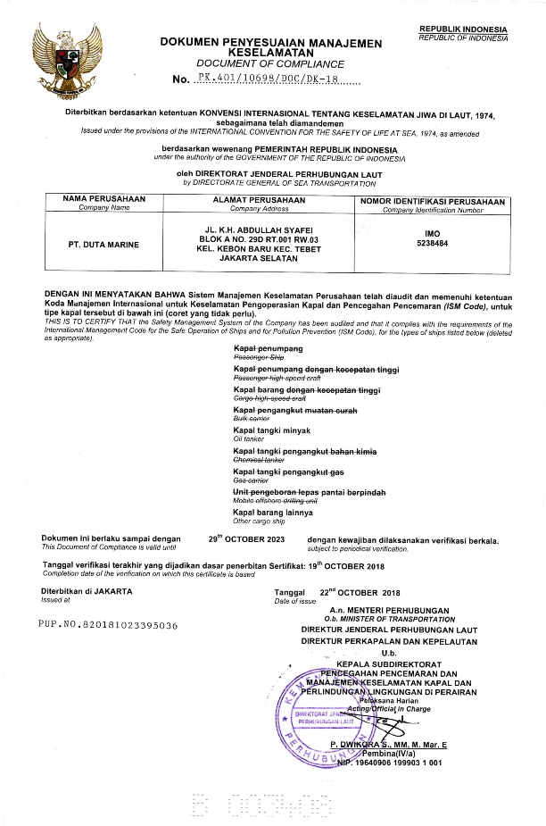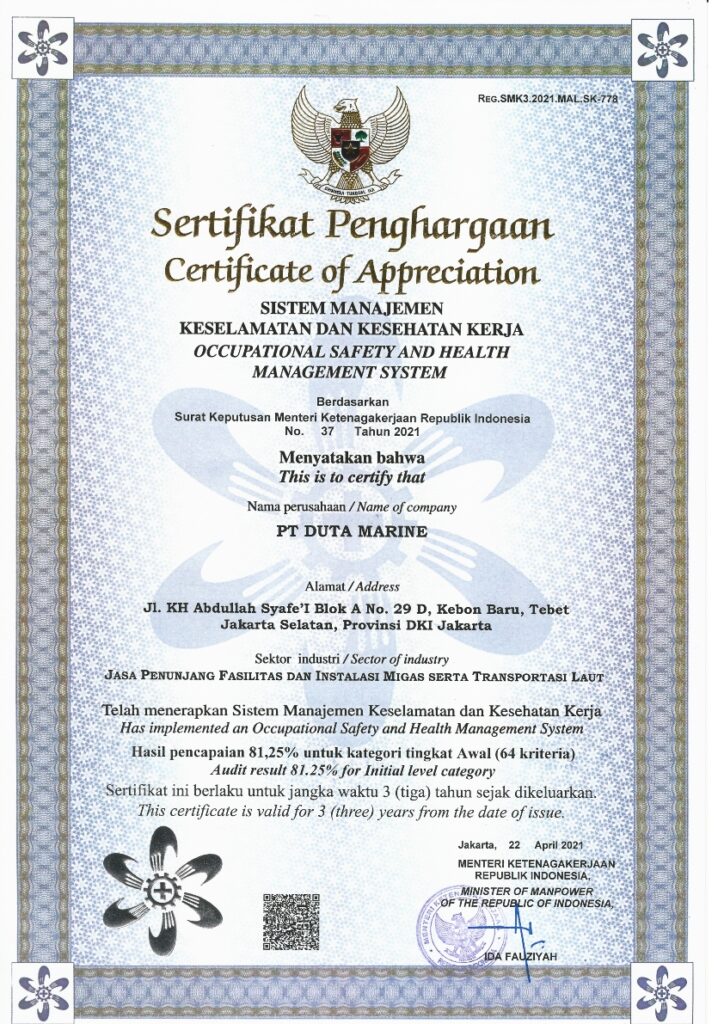 Duta Marine operates under International Safety Management System (ISM) Code, since Indonesian Government applied Requirements of ISM to be established for domestic vessel and floating offshore vessel.
